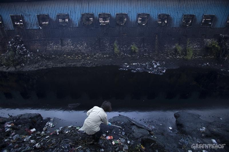 A Greenpeace campaigner takes a water sample from a polluted river near Dadun Village, Xintang, Zengcheng. In Xintang, where the economy is centered around textile production, Greenpeace has found high levels of industrial pollution and has documented the effects on the community.