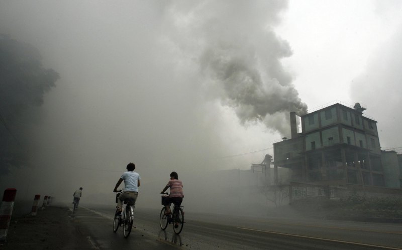 (FILES) This picture taken 18 July 2006 shows cyclists passing through thick pollution from a factory in Yutian, 100km east of Beijing in China’s northwest Hebei province. China has no plans to radically change its reliance on coal and other dirty fuels despite already feeling the impacts of global warming, a leading Chinese meteorologist said 06 February 2007. In the first official Chinese response to a stark UN report issued last week on climate change, Qin Dahe said China lacked the technology and financial resources for a wholesale conversion to cleaner energy sources. AFP PHOTO/Peter PARKS/FILES (Photo credit should read PETER PARKS/AFP/Getty Images)
