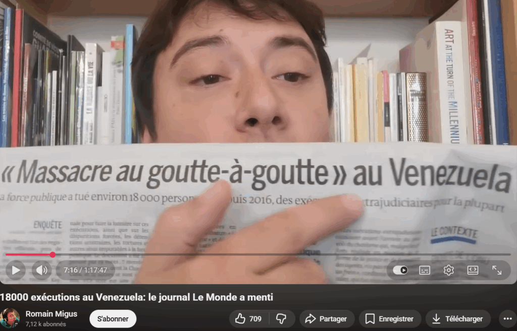Romain Migus illustre parfaitement cette guerre de l’information en démystifiant un article du journal Le Monde qui évoque « 18 000 exécutions extrajudiciaires » (voir la vidéo ci-dessous). Dans l’un de ses papiers, Maurice Lemoine démontre, lui aussi, sans peine, que le chiffre avancé par le média de Xavier Niel et repris partout en France, ne correspond à aucune forme de réalité. En effet, comme expliqué précédemment, les organisations les plus farouchement opposées au gouvernement Maduro, elles-mêmes, ne proposent pas de telles données.