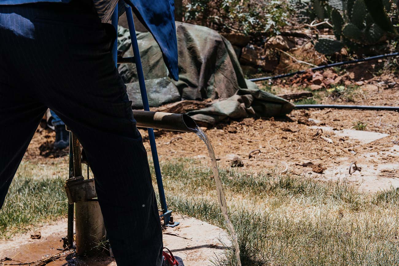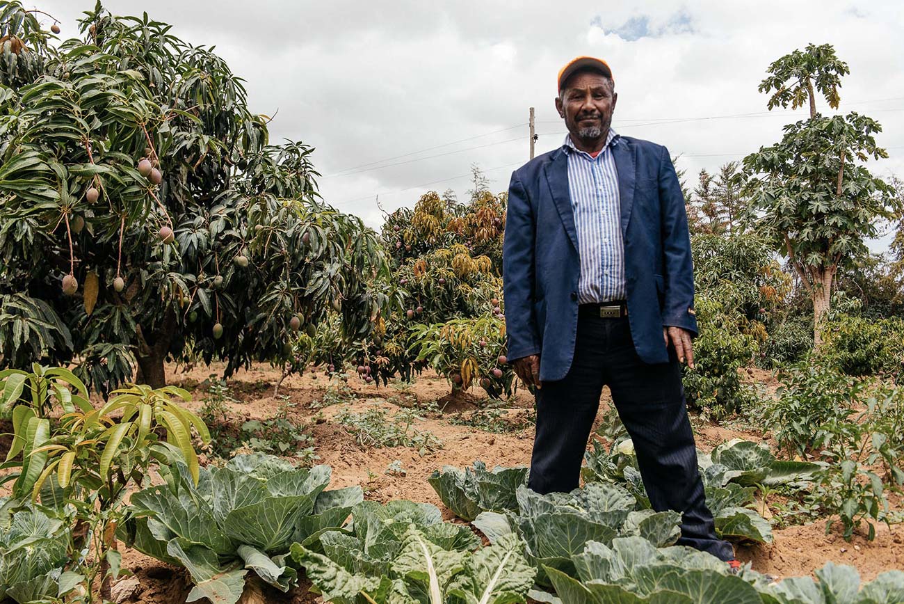 Tout autour de sa petite maison, le jardin est luxuriant, un paradis vert au beau milieu d’un territoire aride. On y trouve pommes, mangues, oranges, avocats, pastèques, café, chili, choux, maïs, teff, … Il y a ici toute la végétation présente dans l’ensemble de l’Éthiopie. Et tout ça grâce à l’eau et sa bonne gestion : tout d’abord, deux puits qu’il a creusés de ses mains, couplés à un système d’irrigation qui donne vie à ce sol sablonneux, brûlant et desséché pendant des décennies : « tous les fermiers d’Éthiopie viennent ici pour voir ce laboratoire et apprendre de notre expérience. Ma motivation est née de la stratégie du gouvernement pour une économie verte. Ils ont encouragé les gens à changer leur manière de faire face aux famines, à la sécheresse, aux migrants et à la pauvreté. »