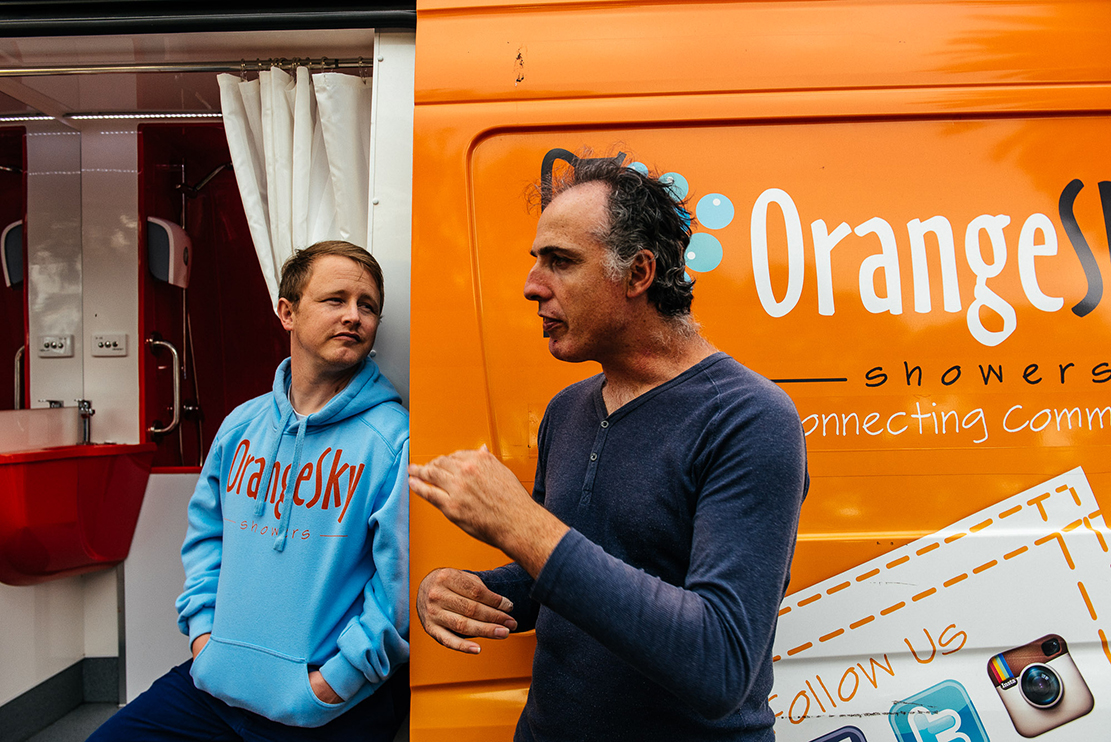 Kieren Malley (à gauche sur la photographie) est étudiant et fait partie des bénévoles pour Orange Sky Showers. “Cela m’était insupportable de voir des personnes sans-abri et je voulais absolument faire quelque chose. En échangeant avec ces personnes, on les reconnecte à la communauté et cela booste réellement leur moral. C’est très important.”