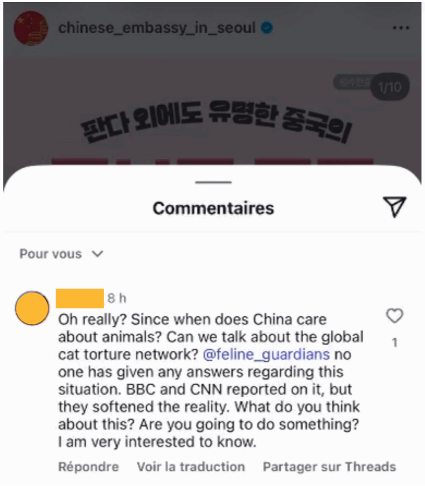 Audrey : « Avant de faire partie de Gardiens des Félins, on a écrit trois fois à l’ambassade de Chine en Suisse et on a été ignorées. J’ai aussi posé des questions poliment sur les réseaux de l’ambassade de Chine à Séoul : mes commentaires ont été supprimés et les commentaires ont été restreints de manière générale. C’est un schéma récurrent : les messages sont effacés, bloqués. »