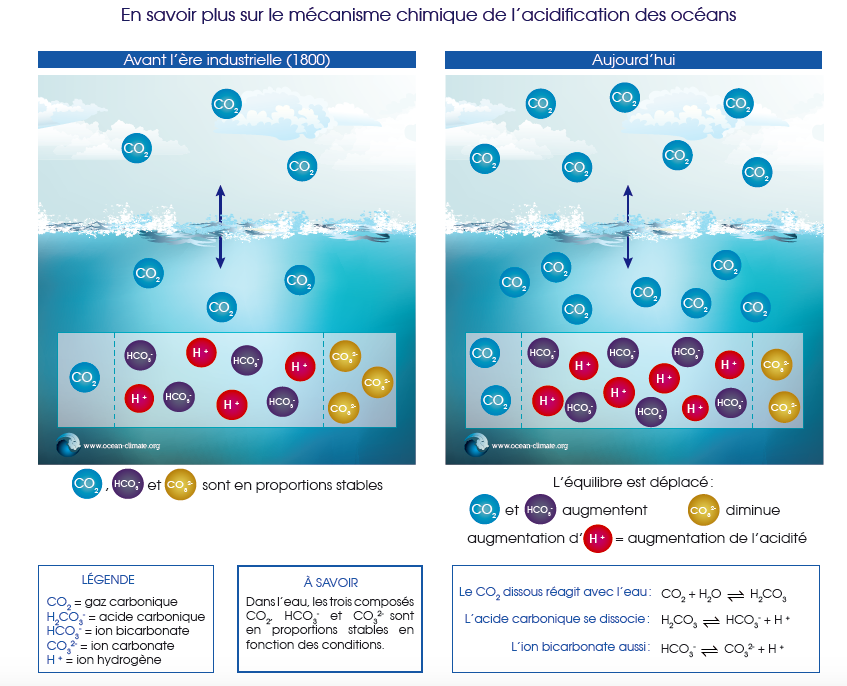 Cette fois-ci, le rythme effrayant de l’acidification des océans n’est pas dû à un évènement extérieur mais à notre utilisation démesurée d’énergies fossiles qui entraîne une absorption excessive de CO2 par les eaux océaniques. Selon le rapport du GIEC dédié aux océans et à la cryosphère, les eaux marines ont emmagasiné entre 20 et 30 % des émissions de carbone anthropique depuis 1980, ce qui a gravement changé la structure chimique de ceux-ci. Certains scientifiques redoutent l’imminence d’un effondrement écologique aquatique, ce qui, à terme, pourrait avoir des conséquences catastrophiques pour l’humanité. L’impact est déjà ressenti par certaines populations côtières qui dépendent des écosystèmes marins mis à mal par cette acidification. Cette modification du pH océanique a notamment un impact terrible sur les populations de certains mollusques (moules, huîtres, palourdes…) en raison d’une diminution d’ions carbonate nécessaires à la formation de leurs coquilles. D’autre part, elle est aussi délétère pour le plancton calcaire qui constitue l’alimentation principale d’un grand nombre de poissons. Ajoutons à cela que la diminution de la capacité d’absorption du CO2 par les océans contribue d’autant plus au réchauffement climatique, créant ainsi un véritable cercle vicieux qui risque d’avoir des conséquences désastreuses pour la vie à l’échelle planétaire.