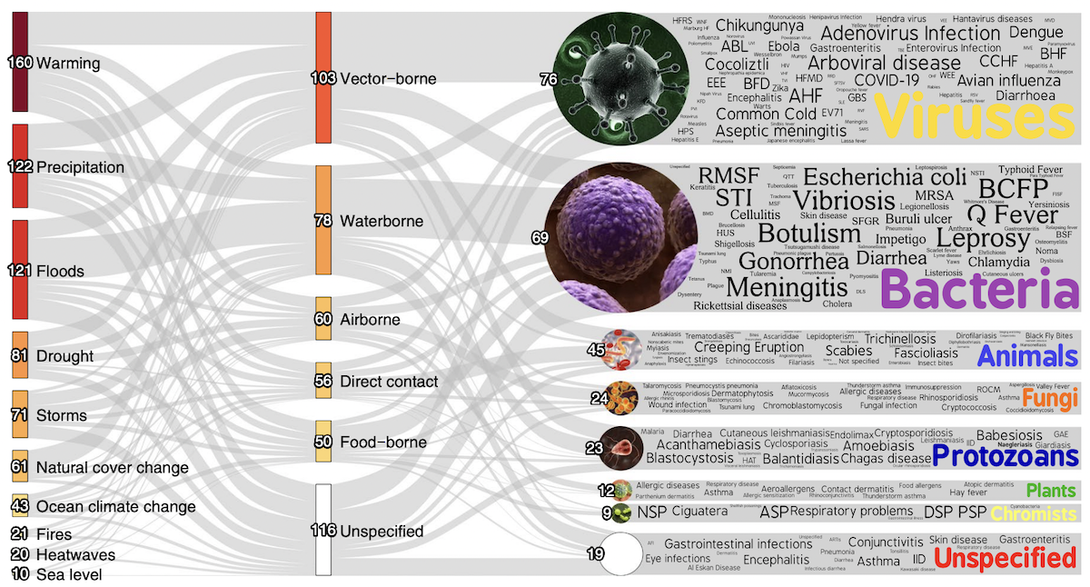 « la perturbation sociétale causée par les maladies pathogènes, clairement révélée par la pandémie de COVID-19, donne un aperçu inquiétant des conséquences potentielles des crises sanitaires imminentes provoquées par le changement climatique ».
