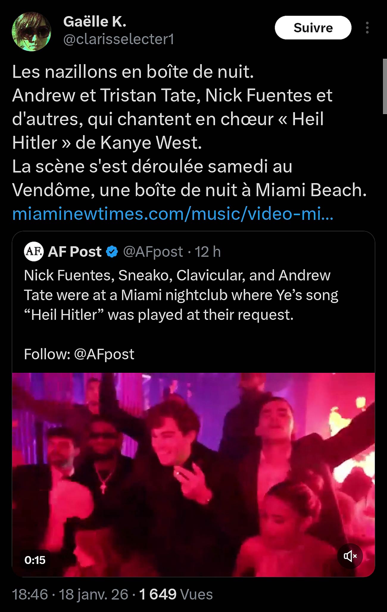 Sur X, la contributrice Gaëlle K. réagit à une vidéo, tournée au Vendôme, une boîte de nuit de Miami Beach et qui montre plusieurs personnalités en ligne d’extrême droite, dont Nick Fuentes, Andrew Tate, Sneako, Clavicular et Myron Gaines, chantant et exécutant des saluts nazis pendant qu’un DJ diffuse le morceau Heil Hitler du rappeur Ye (anciennement Kanye West).