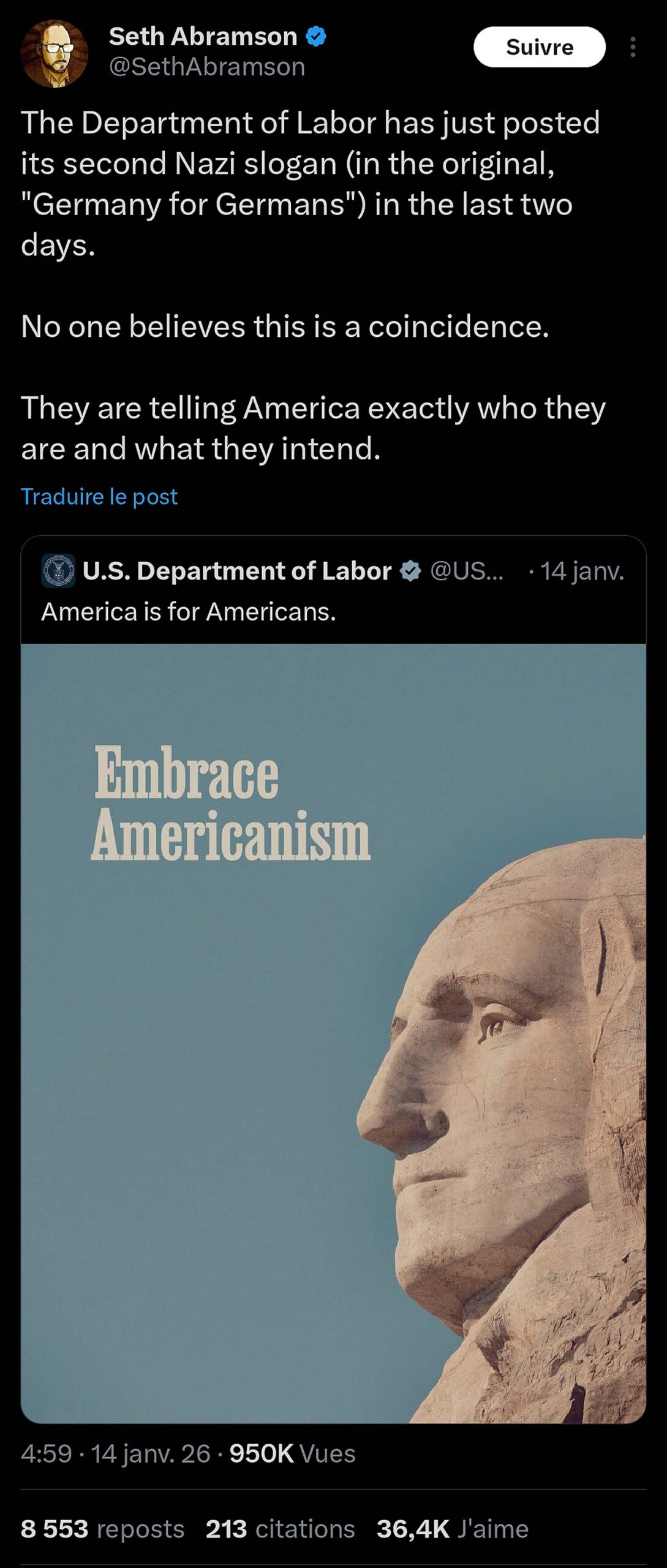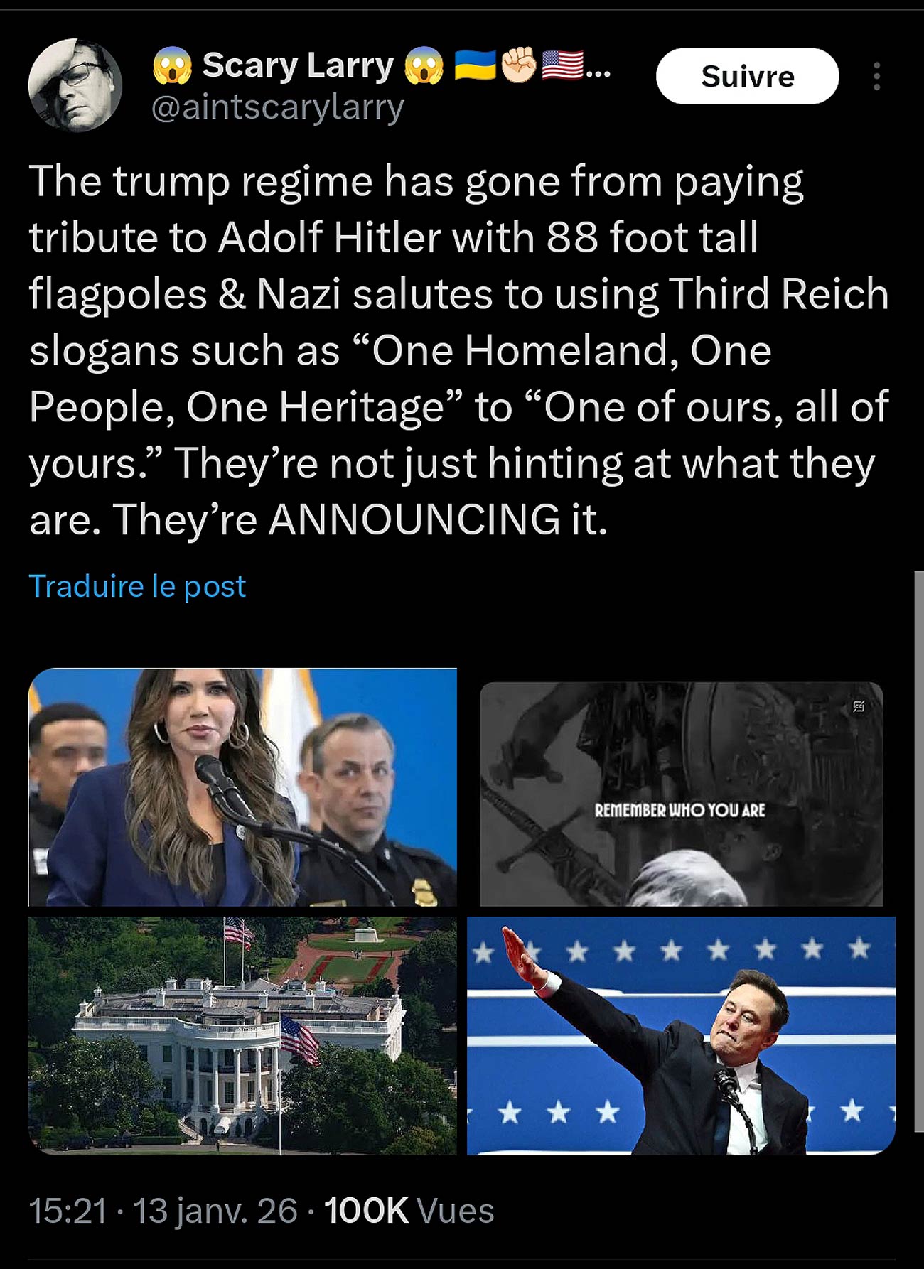 Sur X, le compte Scary Larry dénonce une continuité inquiétante dans la rhétorique et la symbolique employées par le régime Trump. Selon lui, l’exécutif américain est passé d’hommages explicites à Adolf Hitler — avec des mâts de 88 pieds de haut (le chiffre 88 étant un code néonazi pour « Heil Hitler ») et des saluts nazis — à l’usage de slogans directement inspirés du Troisième Reich, tels que « Une patrie, un peuple, un héritage » et « L’un des nôtres, tous les vôtres ».
