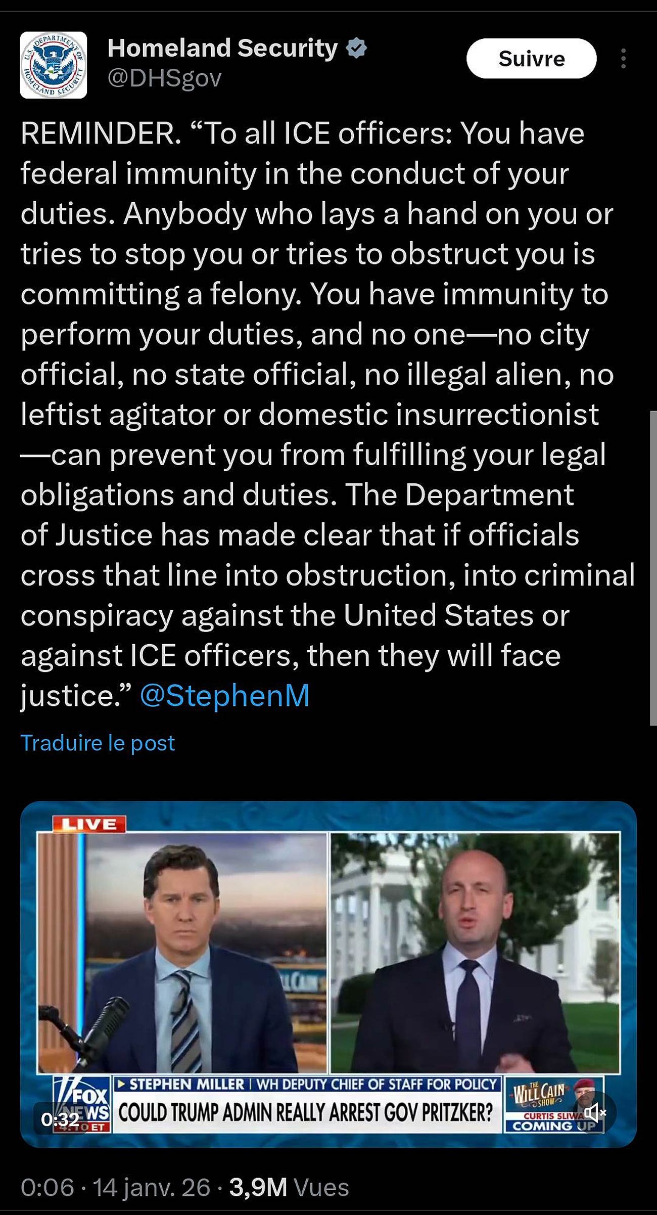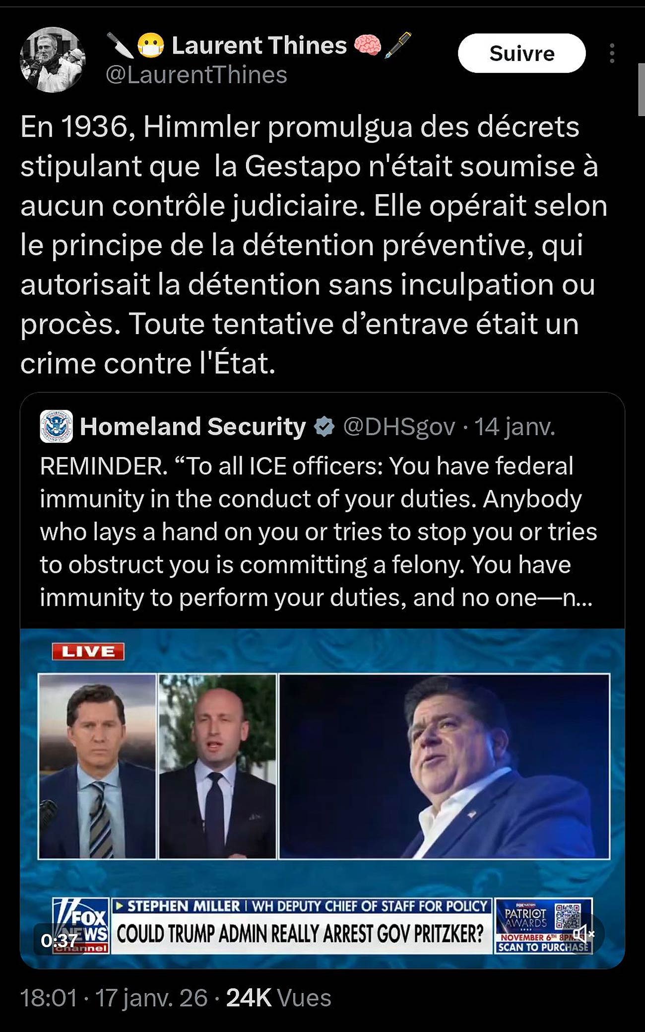Laurent Thines fait un parallèle entre l’ICE et la Gestapo, suite à la déclaration sur X de Stephen Miller, chef de cabinet adjoint de la Maison-Blanche : « À tous les agents de l’ICE : vous bénéficiez de l’immunité fédérale dans l’exercice de vos fonctions. Quiconque vous agresse, tente de vous arrêter ou de vous entraver commet un crime. Vous êtes immunisés pour accomplir vos missions, et personne – ni élu municipal, ni élu d’État, ni immigré clandestin, ni agitateur de gauche, ni insurrectionniste – ne peut vous empêcher de remplir vos obligations légales. Le ministère de la Justice a clairement indiqué que si des fonctionnaires franchissent cette limite et se rendent coupables d’obstruction, de complot criminel contre les États-Unis ou contre les agents de l’ICE, ils seront traduits en justice. »