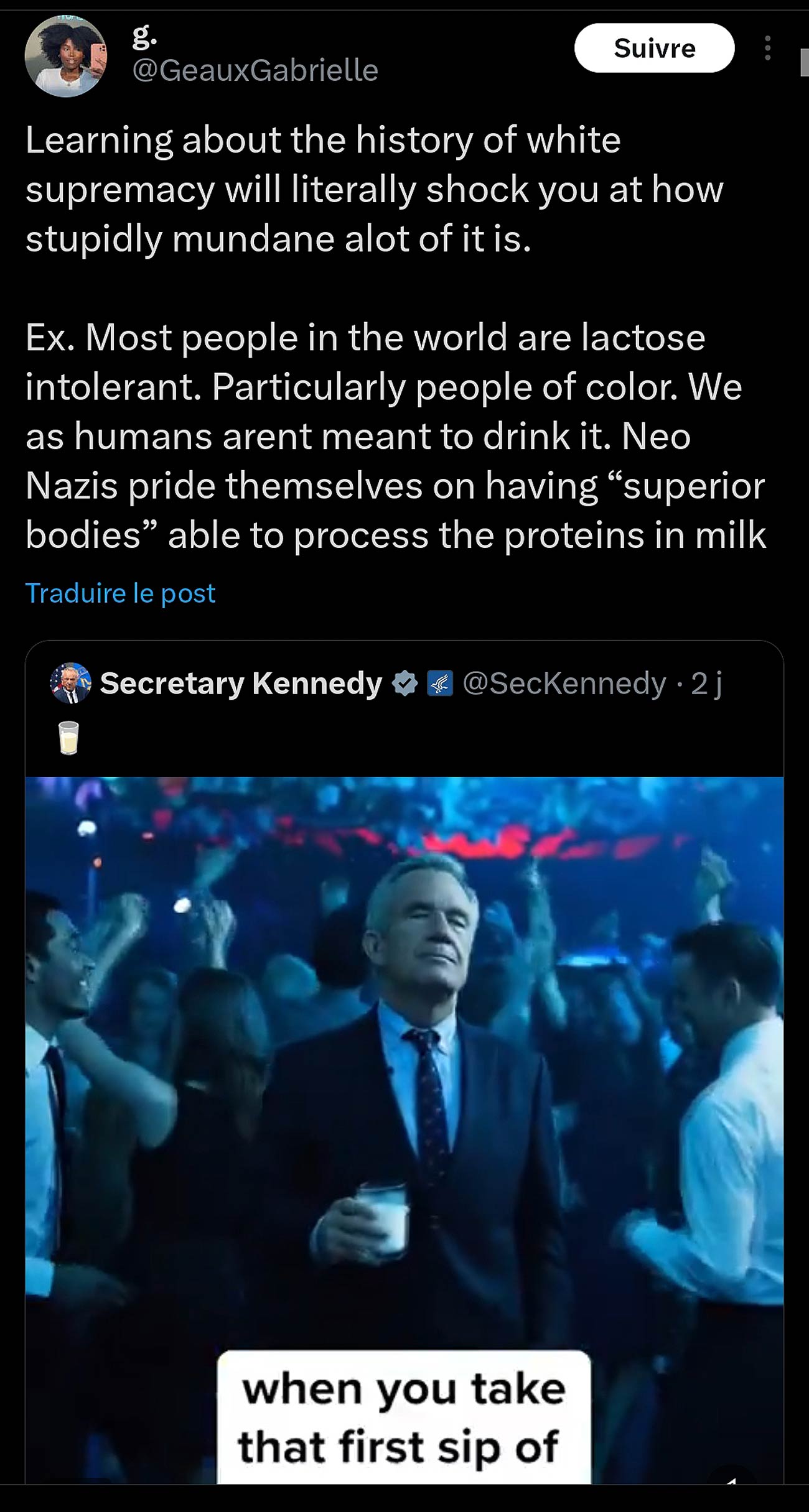Une vidéo publiée sur X du secrétaire à la Santé et aux Services sociaux des États-Unis, Robert Francis Kennedy Jr, dégustant un verre de lait est un clin d’œil à la rhétorique du suprématisme blanc. En effet, selon Gabrielle Geaux, « les néonazis se vantent d’avoir des « corps supérieurs » » en capacité de digérer le lactose.