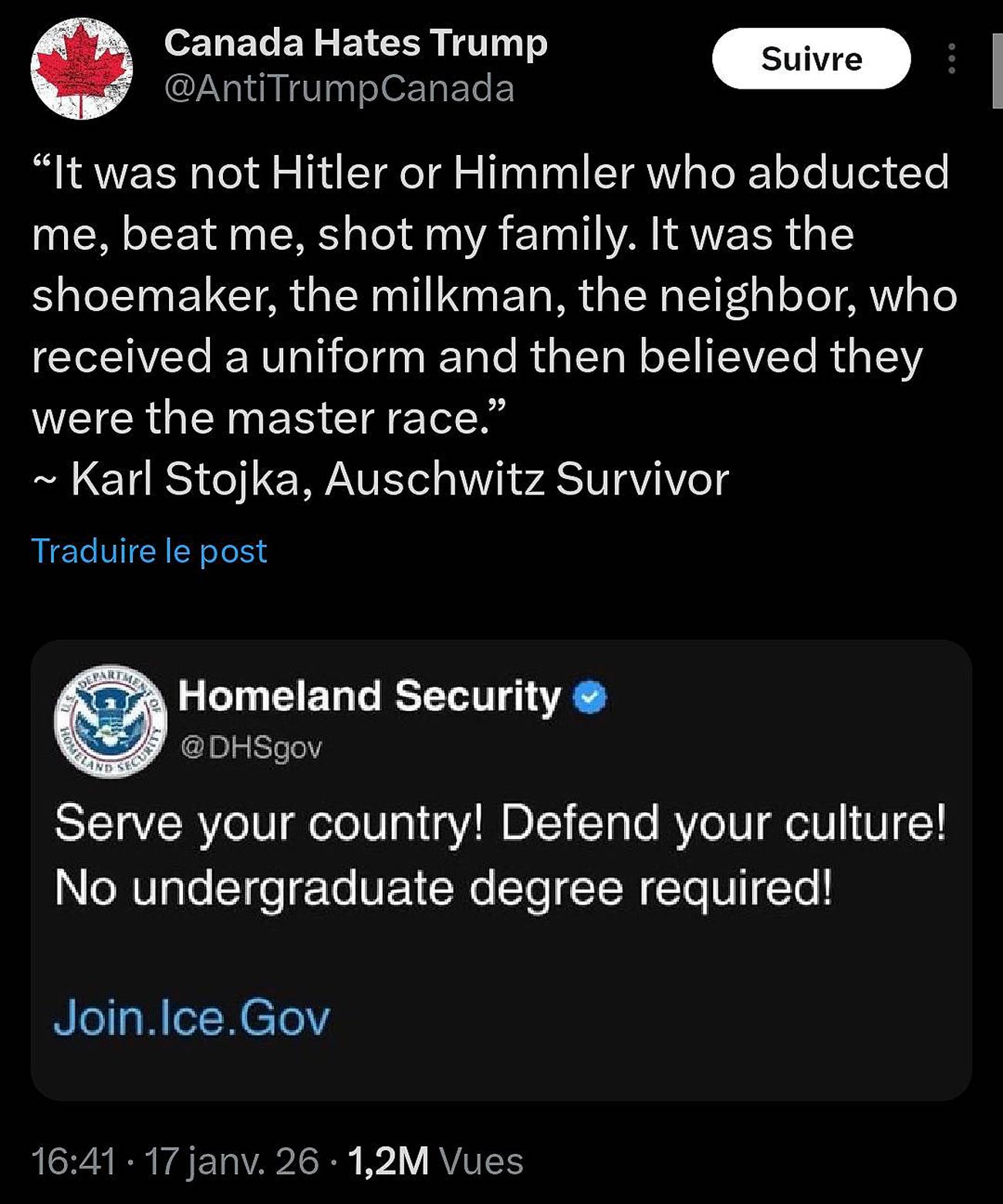 Le compte X Canada Hates Trump a réagi à une publication du compte officiel du Department of Homeland Security invitant les citoyens à rejoindre l’ICE avec le slogan : « Servez votre pays ! Défendez votre culture ! Aucun diplôme universitaire n’est requis ! ».