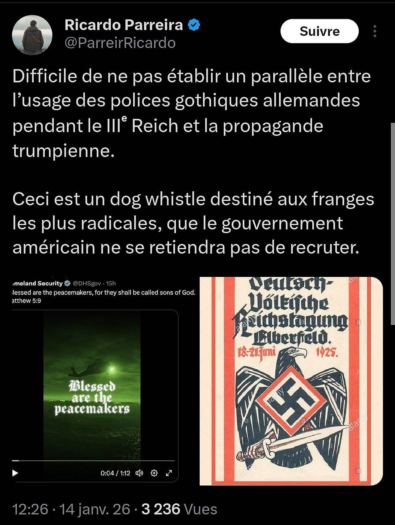 À cela s’ajoute l’analyse de Ricardo Parreira, journaliste indépendant spécialiste des questions liées à l’extrême droite et aux forces de police, connu pour enquêter sur l’usage de symboles, codes et slogans associés à l’extrême droite dans les institutions (notamment policières). Il soutient également que l’utilisation de polices gothiques allemandes dans certains messages officiels rappelle celles utilisées par la propagande nazie, et qu’il s’agit, selon lui, d’un dog whistle destiné à séduire les groupes les plus radicaux, laissant entendre que le gouvernement américain pourrait chercher à les rallier.