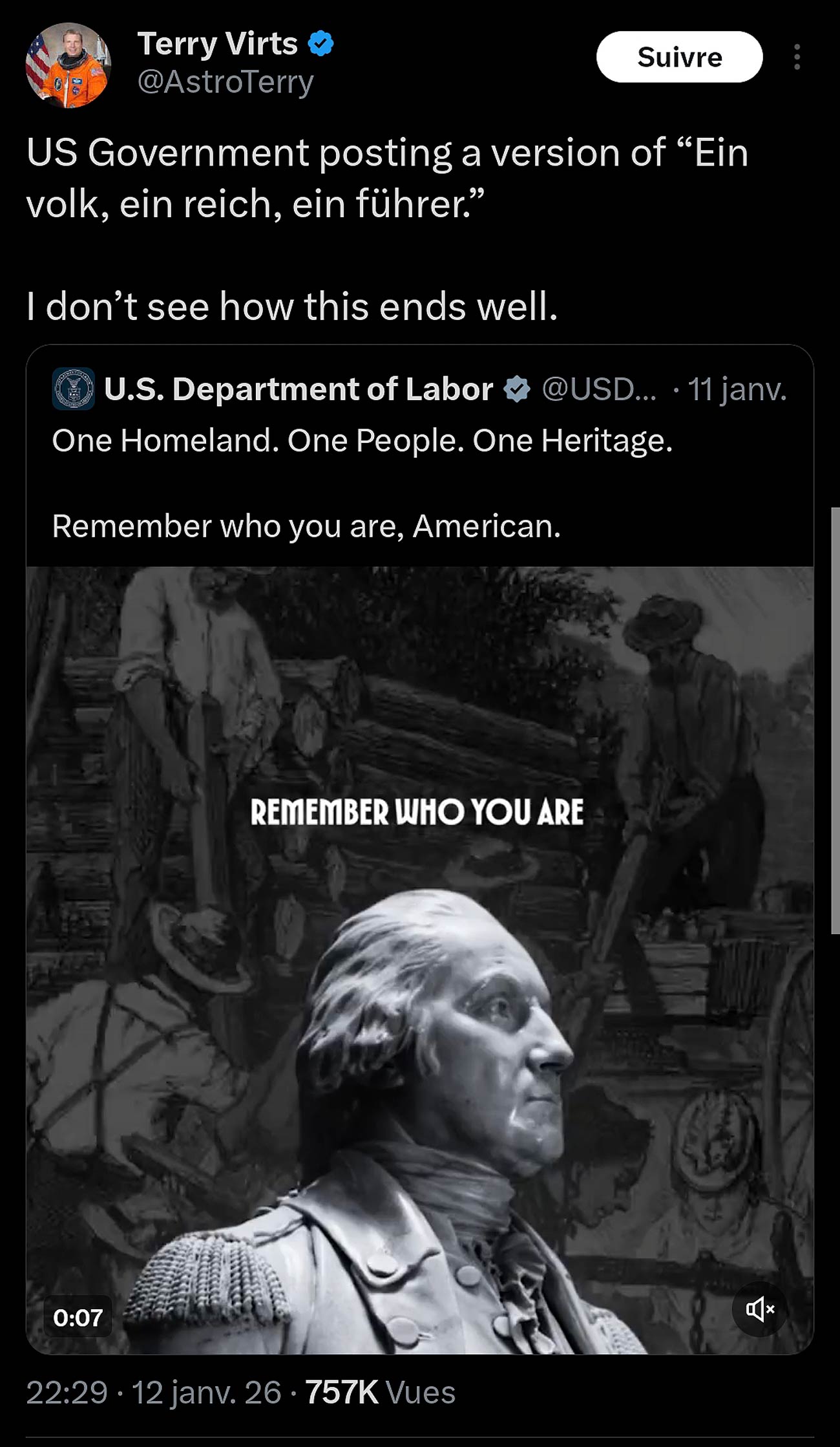 Le passage de Musk dans l’administration Trump augurait la pente autoritaire sur laquelle les USA sont désormais lancés. Le gouvernement trumpiste ne cache même plus son attrait pour le régime nazi, tant sur le fond que sur la forme, comme en témoignent récemment le meurtre de Renee Good par l’ICE et la multiplication de dog whistle nazis.