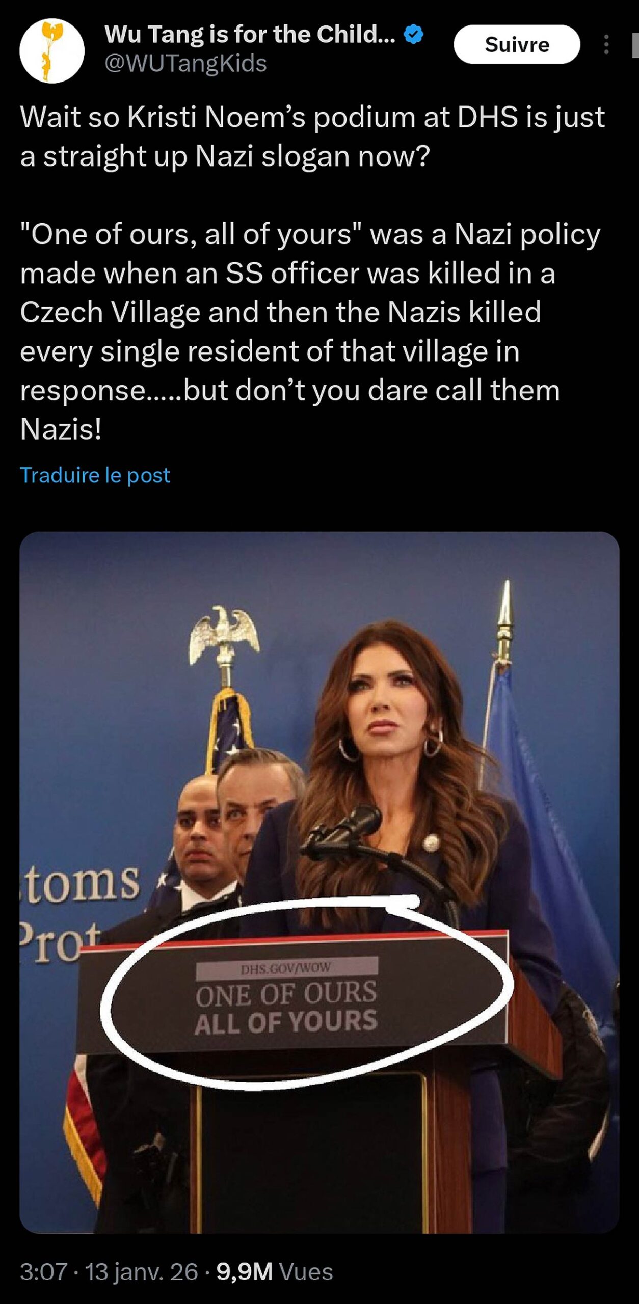 On lit « Un des nôtres, tous les vôtres » sur le pupitre de Kristi Noem, secrétaire à la Sécurité intérieure des États-Unis lors d’une conférence de presse le 8 janvier 2026. Bien que l’origine de ce slogan soit sujet à débat, il fait indéniablement référence à une politique nazie mise en place en 1942, à la suite de l’assassinat de Reinhard Heydrich. Les nazis appliquèrent une politique de représailles collectives en Tchécoslovaquie, allant jusqu’à la destruction totale de villages entiers comme Lidice et Ležáky.