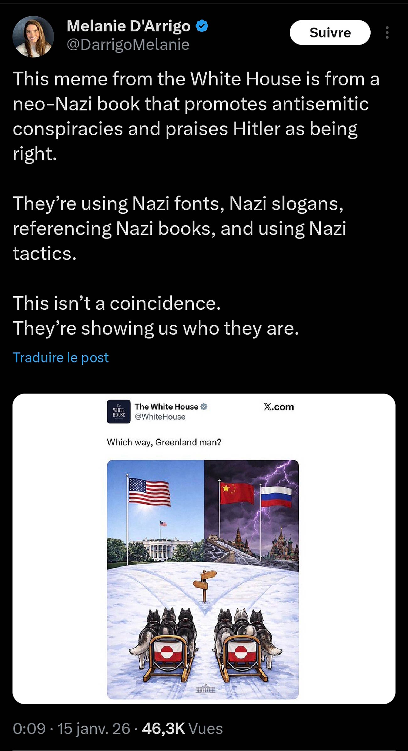 D’Arrigo attire également l’attention sur un mème diffusé par la Maison Blanche, cette fois inspiré du livre Which Way Western Man de William Gayley Simpson (1978), ouvrage néonazi qui propage des théories du complot antisémites et présente Hitler comme ayant eu raison, appelant à la déportation des Juifs et des Noirs. Selon elle, ce mème ne se limite pas à un simple message visuel : il mobilise des références explicites au nazisme et reprend des tactiques historiques de propagande et d’exclusion.