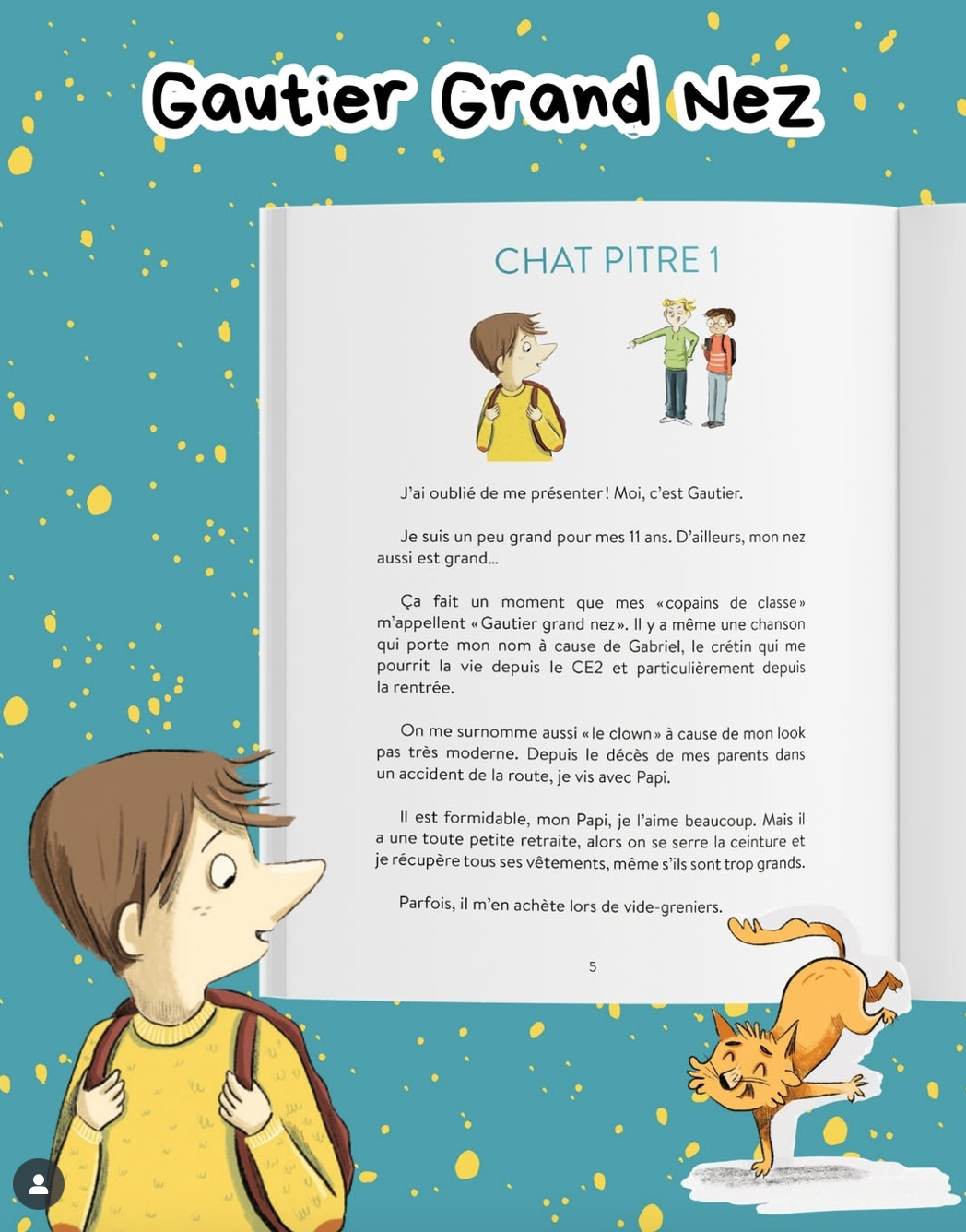 Ce livre raconte l’histoire de Gautier, 11 ans, qui a une vie difficile depuis le décès de ses parents dans un accident de voiture. Il vit avec son grand-père et se fait harcelé par un élève de sa classe. Heureusement un chat qui parle – descendant du Chat Botté – lui vient en aide… J’ai écrit ce roman pour les 8-12 ans avant que le harcèlement scolaire soit un sujet de préoccupation nationale, car depuis 2022, c’est un délit. »