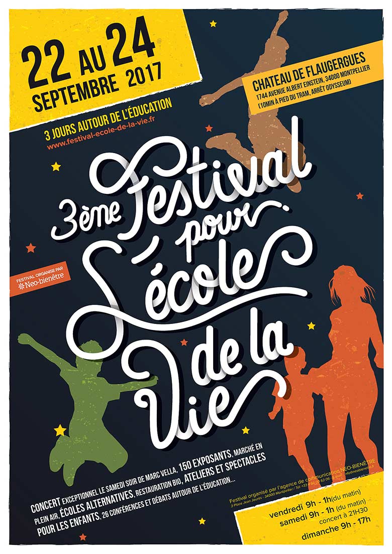 Du 22 au 24 septembre 2017 se tiendra le 3ème Festival pour l’école de la vie au Château de Flaugergues à Montpellier. Ce festival, organisé par Néo-bienêtre est centré autour du bien être de l’enfant à travers l’exploration de techniques d’éducation alternatives. Les deux premières éditions du festival avaient été couronnées de succès. En 2016, 9000 visiteurs avaient été accueillis. Pour la présente édition, l’organisateur espère en attirer 12 000.