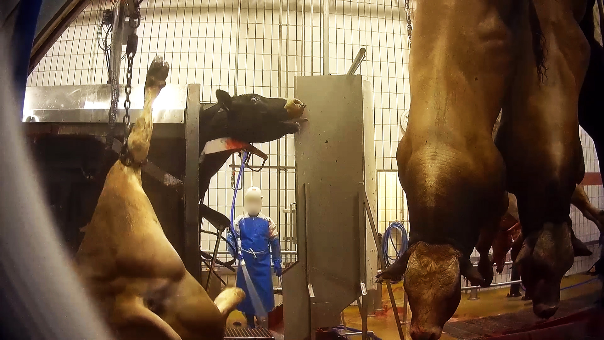 Au delà du manque de main d’oeuvre, ce sont les pratiques d’abattage elles-mêmes qui sont de tout urgence à revoir. Ainsi, à de nombreuses reprises, des infractions à la réglementation se produisent devant les yeux des agents des services vétérinaires et ne déclenchent aucune réaction de leur part. Thomas assiste alors impuissant aux souffrances insoutenables des animaux : dans le cadre de l’abattage rituel, des bovins encore conscients après avoir été égorgés sont suspendus par une patte à la chaîne d’abattage. Aucun contrôle ou étourdissement d’urgence ne vient abréger le supplice des animaux. Malgré la présence d’un rideau d’obstruction, les suivants observent avec horreur leurs congénères suspendus à la chaîne en train de se vider de leur sang.