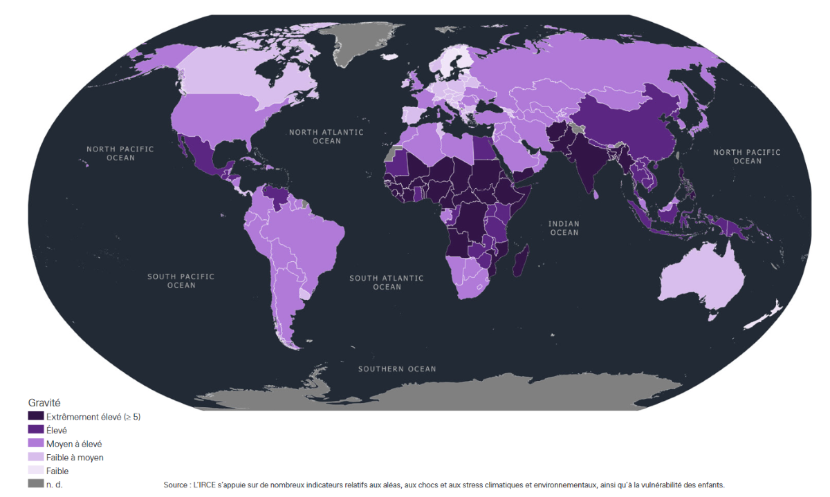 Tous les pays du monde sont ainsi classés par l’organisation selon le degré d’exposition des enfants aux chocs climatiques et environnementaux (comme des cyclones ou encore des canicules…) et leur degré de vulnérabilité à ces chocs, mesuré en fonction de leur niveau d’accès à des services essentiels. Le croisement de ces données permet la création d’un Indice des risques climatiques pour les enfants (IRCE), créé spécialement à l’occasion de la sortie de ce nouveau rapport. Celui-ci se fonde donc à la fois sur le corpus croissant des nouvelles données probantes sur le climat ainsi que sur les données concernant la vulnérabilité des enfants. Il rassemble dans ces deux catégories 57 variables afin de mesurer les risques existant dans l’ensemble des pays et régions du monde, et fournit ainsi le premier aperçu complet des risques climatiques pesant sur les enfants.