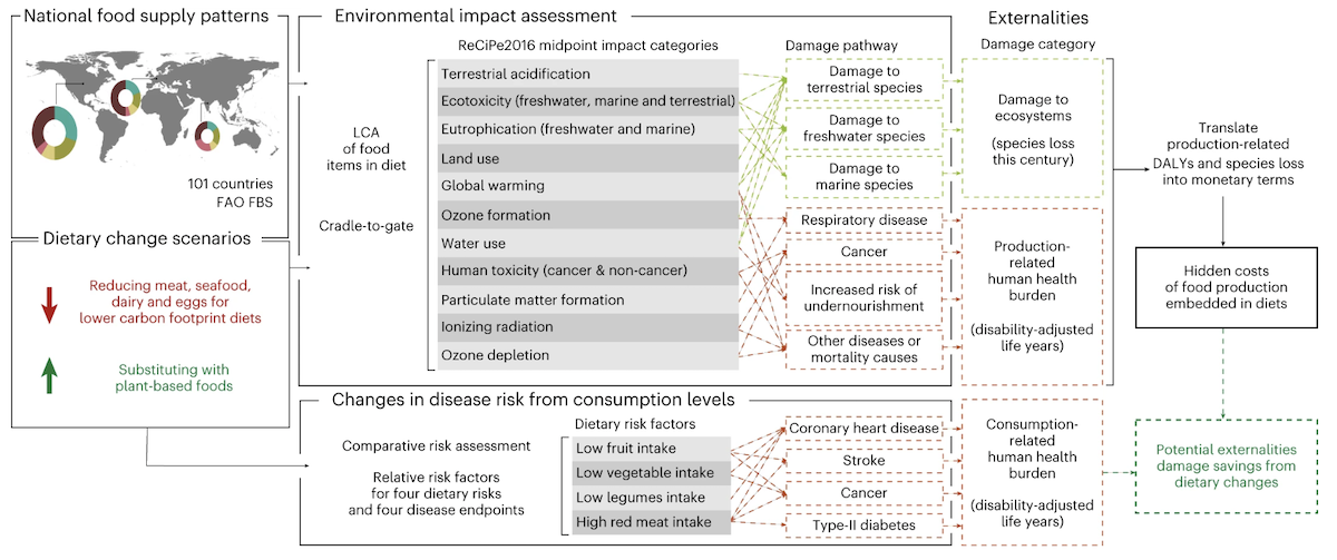C’est ce qu’assurent Elysia Lucas, Miao Guo et Gonzalo Guillén-Gosálbez, chercheurs au King’s College de Londres et à l’École polytechnique fédérale de Zurich, mais aussi auteurs d’une analyse des coûts cachés de notre alimentation. Publiée le 15 mai 2023 dans la revue scientifique Nature Food, cette étude combine les principes de diagnostic du monde vivant et les facteurs de monétarisation afin d’estimer la valeur monétaire des dommages causés à la santé humaine, aux écosystèmes et au climat par la production et la consommation de nourriture dans une centaine de pays du globe.