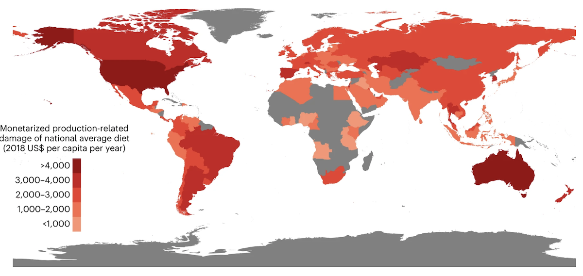 En termes de distribution régionale, les régimes alimentaires moyens en Amérique du Nord et en Océanie produisent les externalités monétarisées annuelles les plus élevées par habitant (environ 4 200 dollars), tandis que les externalités les plus faibles proviennent des régimes alimentaires d’Asie du Sud et d’Afrique subsaharienne (environ 1 100 dollars par habitant. Les chercheurs constatent ainsi de grandes disparités dans les externalités annuelles par habitant entre les nations, avec une multiplication par cinq de l’Éthiopie aux États-Unis. « Pour les autres régions, nous découvrons des niveaux plus modérés de coûts externes annuels associés à leur régime alimentaire moyen, compris entre 2 500 et 2 800 dollars pour l’Europe, l’Asie centrale, l’Asie de l’Est, l’Amérique latine et les Caraïbes et entre 1 700 et 2 000 dollars pour le Sud-Est de l’Asie, l’Asie de l’Ouest et l’Afrique du Nord ».