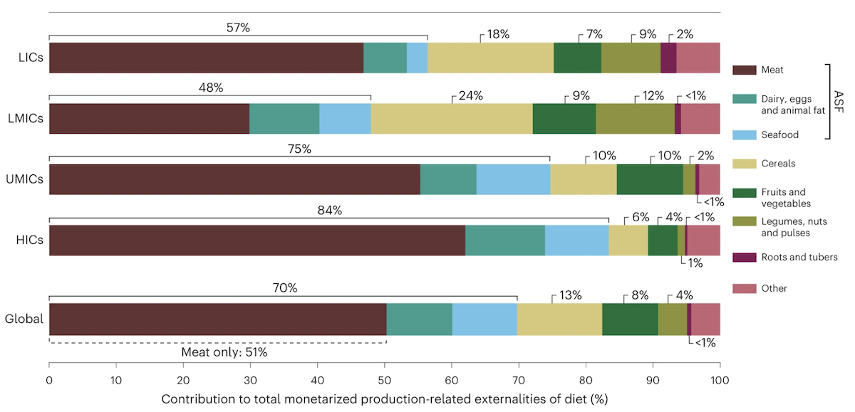 Ces résultats s’expliquent facilement : les niveaux élevés de consommation d’aliments d’origine animale tels que la viande, les fruits de mer, les produits laitiers, les œufs ou encore les graisses animales dans les pays à revenu élevé influencent fortement les coûts indirects de l’alimentation. Par ailleurs, « les céréales représentent un autre contributeur majeur aux externalités de tous les groupes de revenus, mais en particulier pour les revenus les plus faibles où les régimes alimentaires dépendent fortement des cultures céréalières de base », détaillent les auteurs de l’étude.