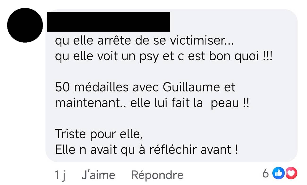 « Guillaume réussit aussi bien sans elle » : Cet argument est hors sujet. La réussite sportive ou médiatique d’un ancien partenaire n’a aucune incidence sur la légitimité d’un témoignage. Il s’agit d’un déplacement du débat destiné à éviter le fond : les violences structurelles décrites dans l’ouvrage.