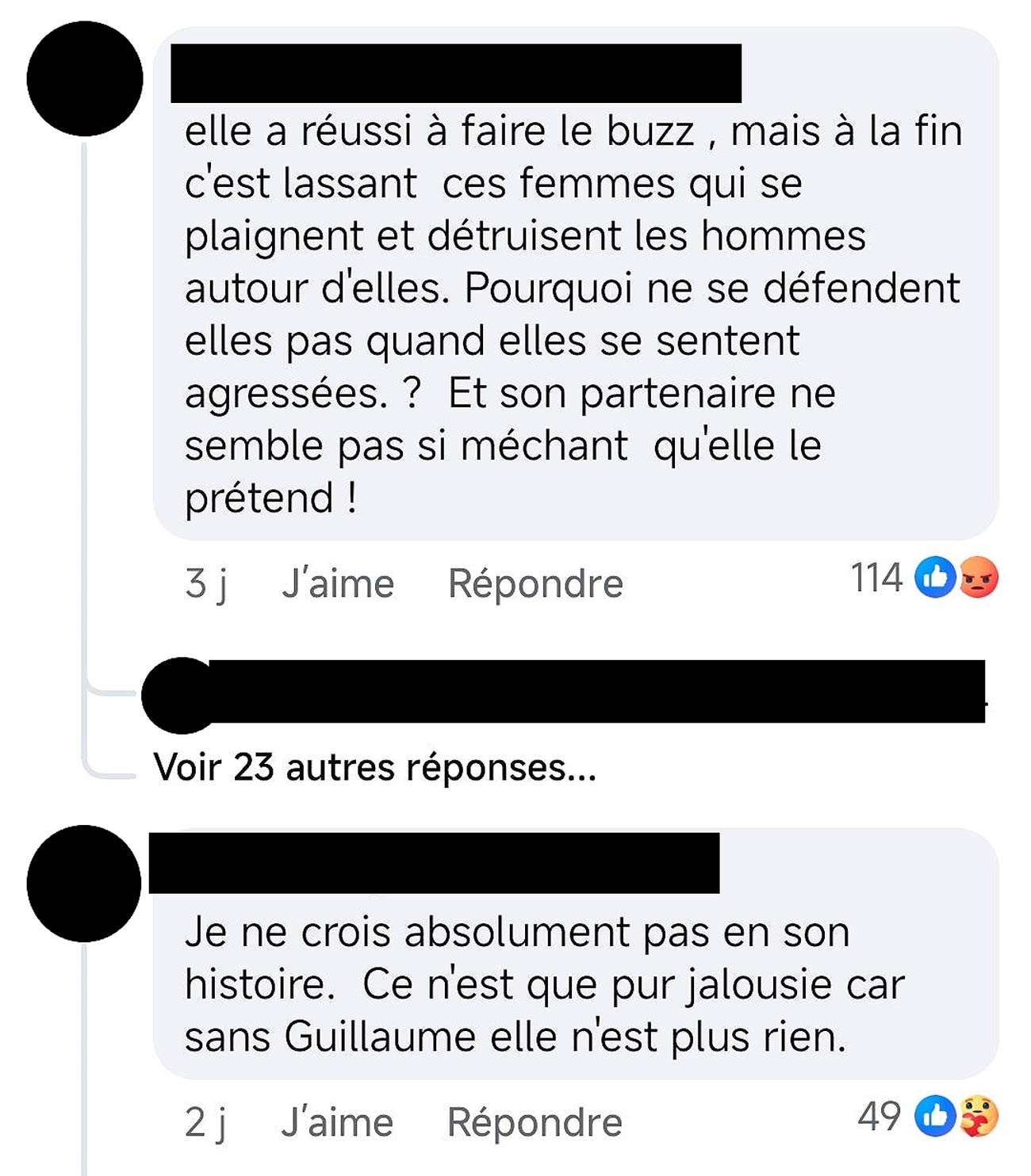 De plus, Gabriella Papadakis a été la cible en ligne de centaines de commentaires caractéristiques de la culture patriarcale qui blâme les victimes qui dénoncent des violences : « pourquoi elle ne s’est pas défendue à l’époque des faits » , « elle n’avait qu’à partir avant », « c’est une ingrate qui crache dans la soupe » , « Guillaume réussit aussi bien sans elle », « elle devrait voir un psy au lieu de se victimiser », « elle veut le déstabiliser par jalousie », « ça ne devrait pas être réglé en public », « il fallait aller en justice », « pourquoi parler maintenant, ce n’est pas le moment », « c’est pour le buzz et l’argent », « elle nuit à son image et aux vraies victimes », « c’est à cause du wokisme » et des moqueries sur son physique