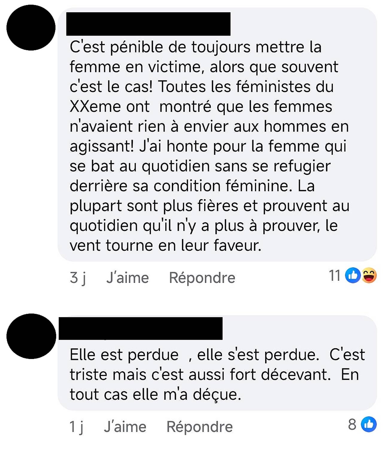 « Elle devrait voir un psy au lieu de se victimiser » : La psychologisation est une stratégie classique de disqualification : elle individualise un problème systémique et transforme une parole politique en fragilité personnelle. Témoigner de violences n’est pas « se victimiser », c’est nommer des faits et analyser un système qui les rend possibles.