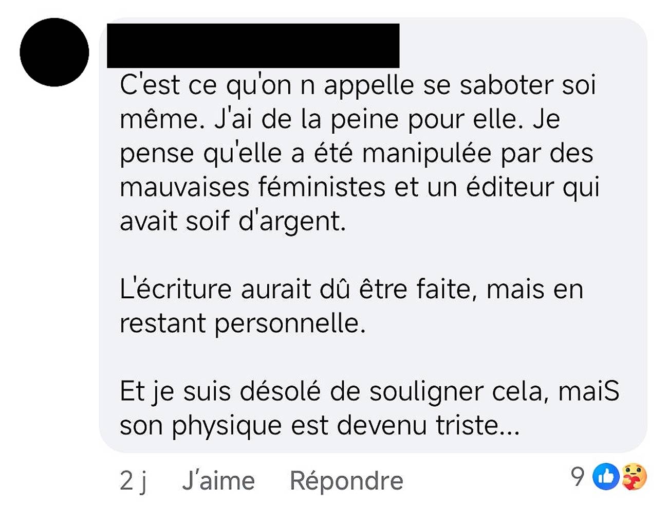Les moqueries sur son physique : Elles relèvent de la violence sexiste la plus classique : réduire une femme à son apparence pour l’humilier et la faire taire. Ce type d’attaque n’a aucun lien avec le fond du propos et révèle surtout l’incapacité à répondre autrement.