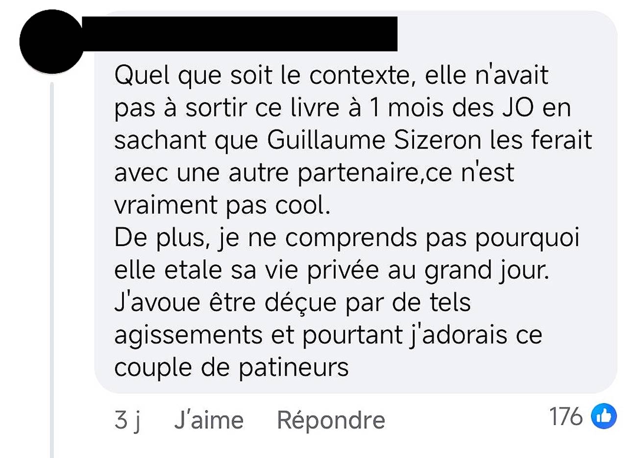 Les médias se sont largement focalisés sur les extraits concernant son ancien partenaire, Guillaume Cizeron, assurément les passages les plus « vendeurs » pour l’audimat même si loin d’être représentatifs de l’ensemble du propos.