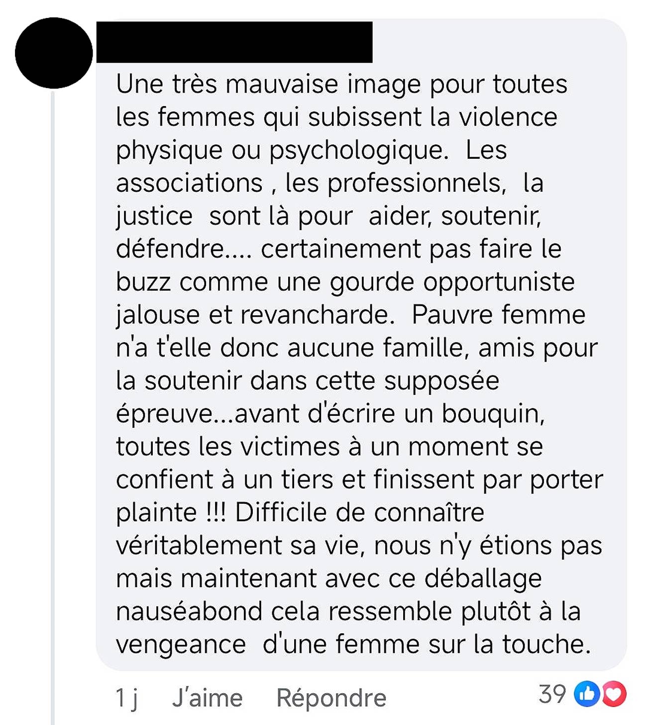 « C’est pour le buzz ou l’argent » : Ce soupçon inverse la charge morale et s’appuie sur un imaginaire sexiste de « la femme vénale », comme si elle avait besoin du buzz et de l’argent pour exister. Il suppose une intention opportuniste sans aucun élément tangible, tout en ignorant les coûts personnels très réels du témoignage (harcèlement, perte de contrats, isolement). S’exposer ainsi est rarement un calcul rentable.