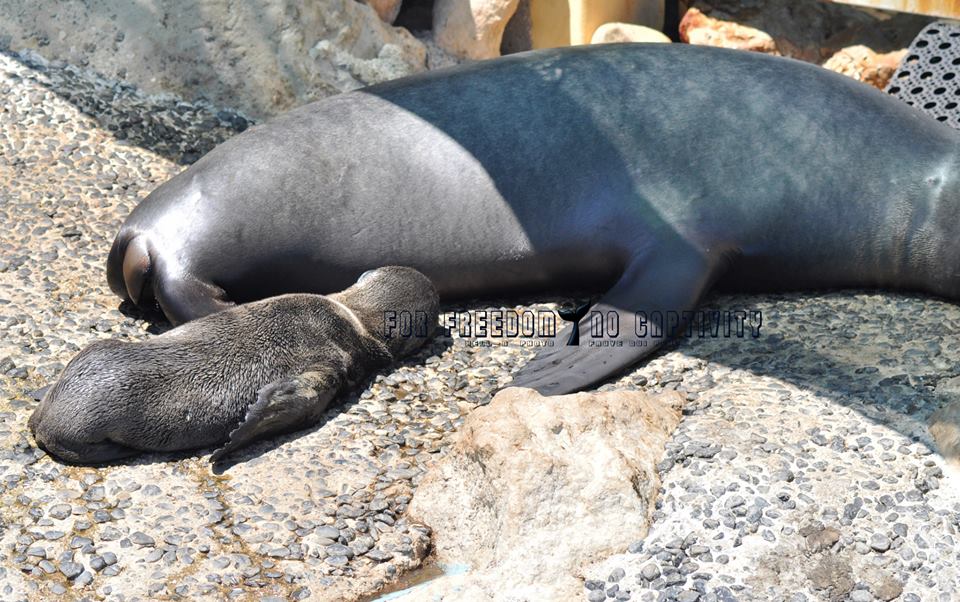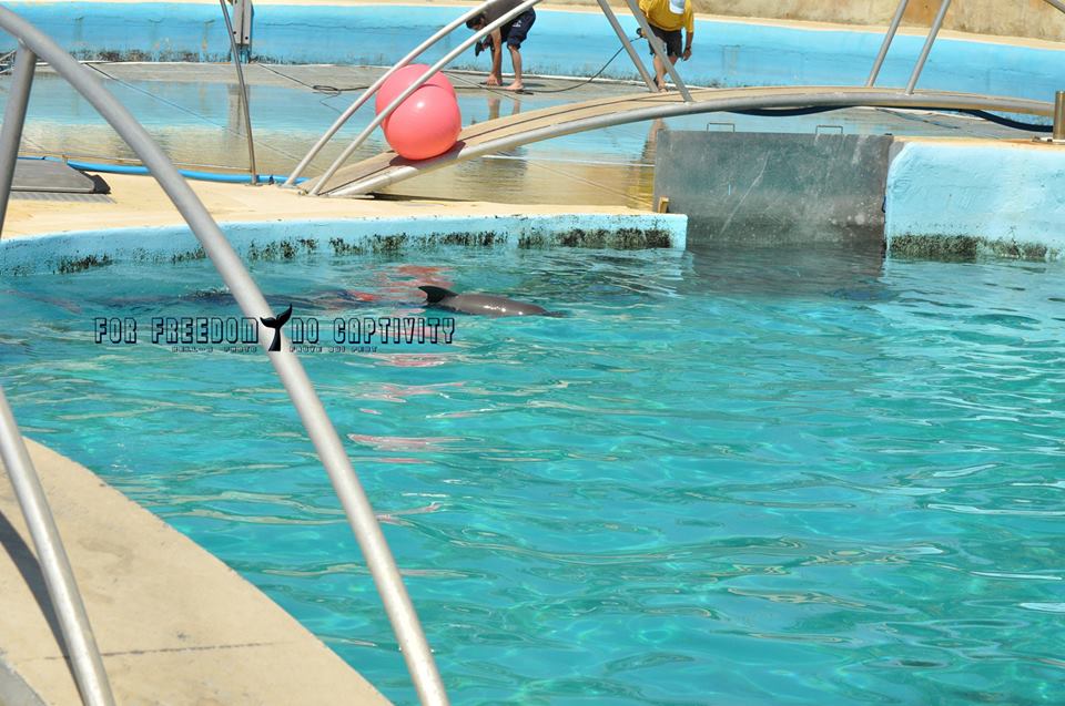 6. Un dauphin femelle adulte avec son petit séparés des autres et confinés dans un très petit bassin