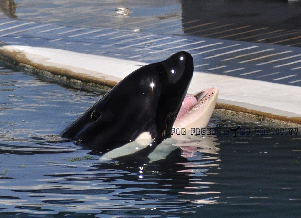 5. L’orque Freya entrain de gratter / mordre les rebords du bassin