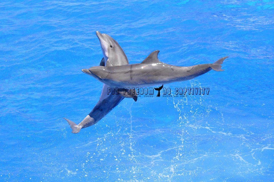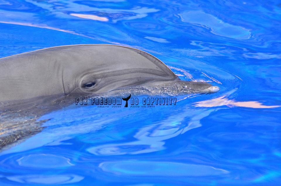 (Les dauphins dans la nature peuvent également avoir la peau marquée, cependant dans le cas de cette photographie, cela est souvent du au fait que les dauphins s’attaquent entres eux en raison de la promiscuité.)