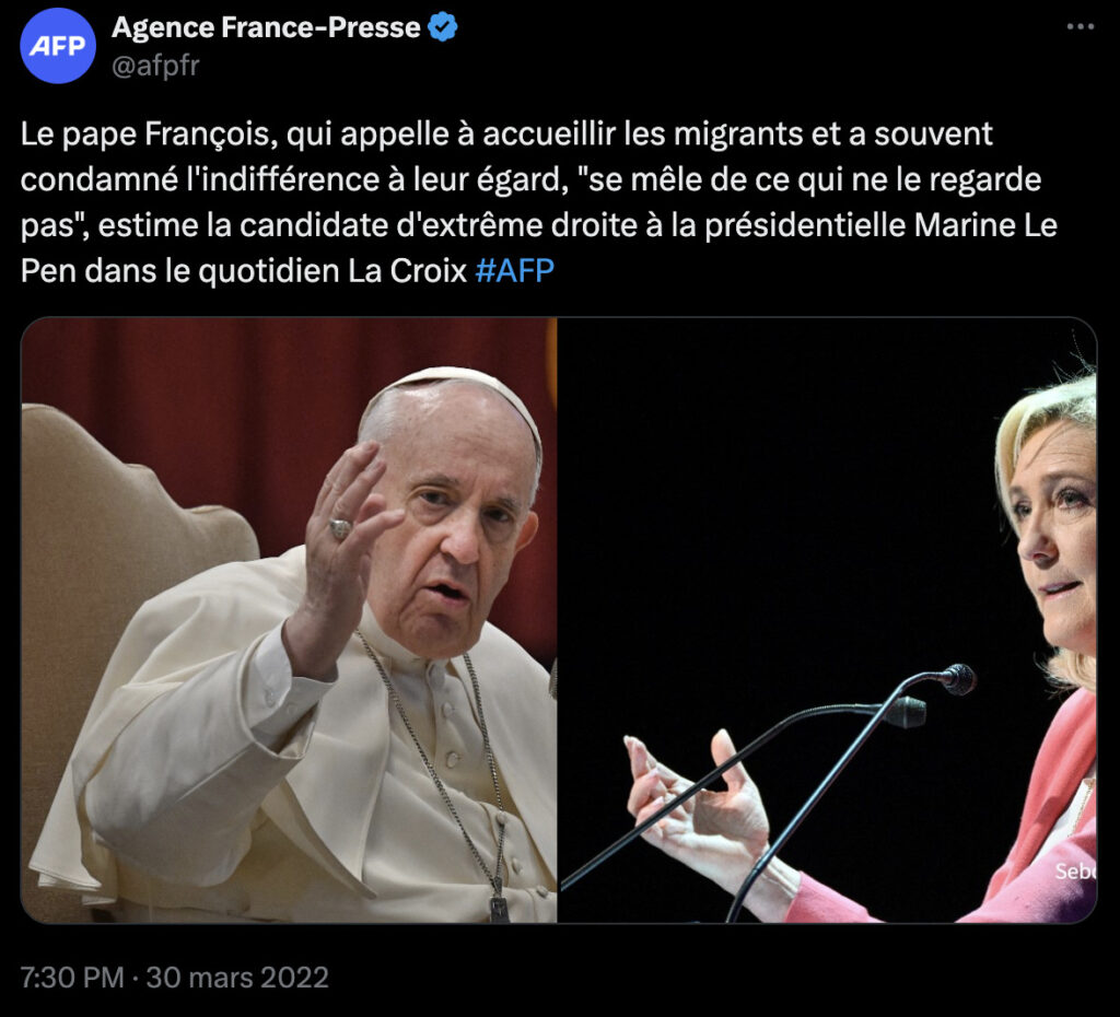 Elle prétend aussi défendre les « racines chrétiennes » de la France alors que son programme migratoire s’oppose diamétralement au message de Jésus, lequel prône l’accueil et l’amour du prochain quelle que soit son origine. D’ailleurs, on ne peut qu’être stupéfait par le refus de dénoncer, chez de très nombreux chrétiens français, cette réappropriation calomnieuse de leur religion.