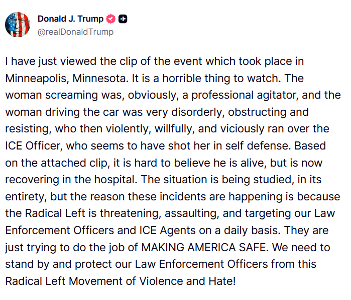 Les forces de l’ICE encerclent ensuite la zone, éloignent les témoins et prennent le contrôle total de la scène. Les secours ne sont pas autorisés à intervenir. Les vidéos captent à la fois les derniers mots prononcés par Renee Good avant d’être abattue (« I’m not mad at you » – « Je ne t’en veux pas ») et ceux de l’agent en cause, dont une insulte sexiste (« F*cking b*tch ») proférée après l’avoir tuée.